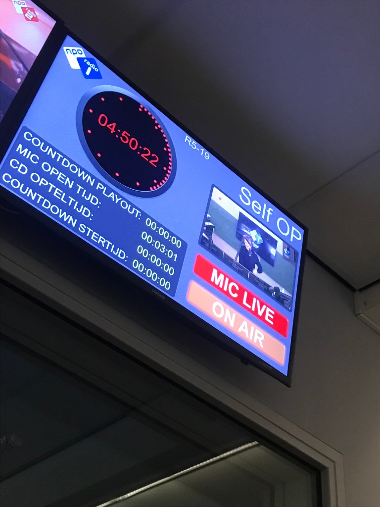 Op maandagochtend 6 januari bezocht ik Radio 1 om bij de ochtendshow van Wouter Bouwman aanwezig te zijn. In dit programma gaat Wouter in gesprek met luisteraars over maatschappelijke stellingen die te maken hebben met recente gebeurtenissen uit het nieuws. Het was interessant om te zien hoe ook de radio snel moet inspelen op de recente ontwikkelingen. Ik was verbaasd over de hoeveelheid luisteraars. Gemiddeld heeft het programma, dat wordt uitgezonden van 4 uur tot 6 uur in de ochtend, 50-70 duizend luisteraars. Wat ik veel vind voor dit tijdstip.